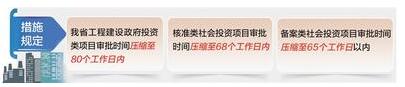 措施规定,我省工程建设政府投资类项目审批时间压缩至80个工作日内,核准类社会投资项目审批时间压缩至68个工作日内,备案类社会投资项目审批时间压缩至65个工作日以内。