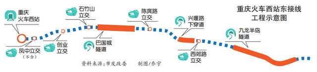 据介绍,重庆火车西站东接线工程位于九龙坡区,西起内环凤中立交(不含),连接重庆西站,东接规划黄桷坪长江大桥(不含)。主要工程包括长隧道2座(九龙半岛隧道、巴国城隧道),中隧道1座(兴堰路下穿道),互通立交2座(石竹山立交、陈庹路立交)、简易立交2座(创业立交、西郊路立交)。
