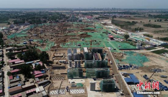 资料图:航拍京雄城际铁路雄安站施工现场。中新社记者 韩冰 摄
