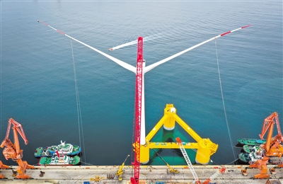 由中国船舶集团海装风电股份有限公司牵头,联合相关单位自主研制的“扶摇号”浮式风电机组浮体平台上配备6.2兆瓦抗台型I类风力发电机组,在深远海应用场将依靠九个对称分布的悬锚链系泊实现固定。图为完成总装的国内首台深远海浮式风电装备“扶摇号”在茂名广港码头静待拖航(无人机照片)。记者 刘大伟 摄