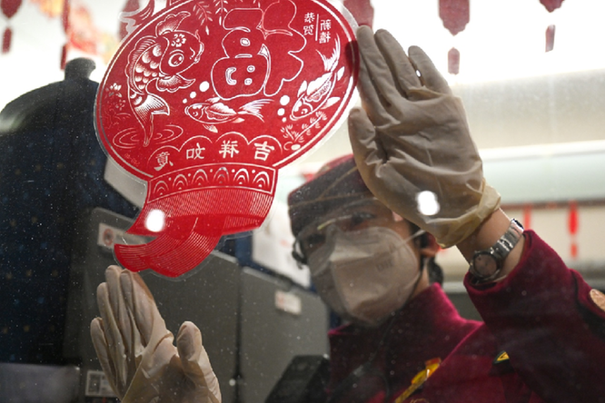 整装待发的乘务人员佩戴手套、口罩、眼镜的防护“三件套”迎接每一位旅客,列车长还送上了吉祥兔胸针小礼物和温馨祝福。