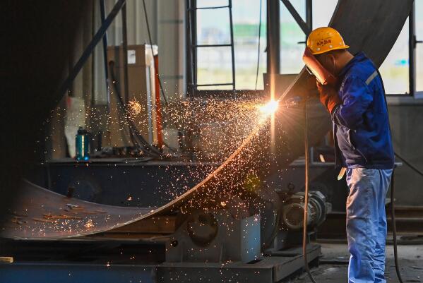 在新疆塔城重点开发开放试验区先行发展区中国水利水电第四工程局有限公司塔城分公司,工人在打磨风机塔筒(7月22日摄)。