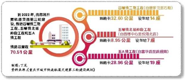 根据批复,到2022年,我市将开展轨道交通第三轮建设,包括四号线二期工程、五号线北延伸段工程和五A线工程,线路总里程为70.51公里。其中,四号线二期工程,自唐家沱至石船,线路长32.60公里,设车站14座;五号线北延伸段工程,自园博中心至悦港北路,线路长8.95公里,设车站7座;五A线工程,自富华路至跳磴南,线路长28.96公里,设车站19座。