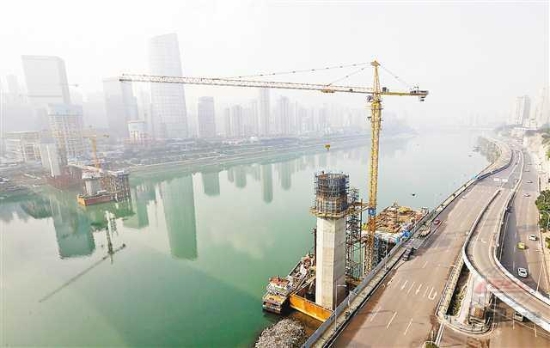 一月五日,建设者正在嘉华轨道专用桥工程紧张施工,目前大桥三个岸上桥墩已全部完成封顶,水中两个桥墩的墩身浇筑也将在三月完工。记者 罗斌 摄(资料图片)