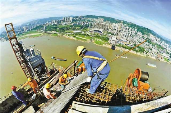 二○一八年六月二十六日,万州长江三桥南岸主墩,工人正在安装避雷针和塔帽封模施工。通讯员 冉孟军 摄(资料图片)