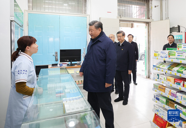 11月10日,中共中央总书记、国家主席、中央军委主席习近平在北京、河北考察灾后恢复重建工作。这是10日下午,习近平在河北保定涿州市双塔街道永济秀园小区门口药店,了解经营恢复情况。新华社记者 王晔 摄
